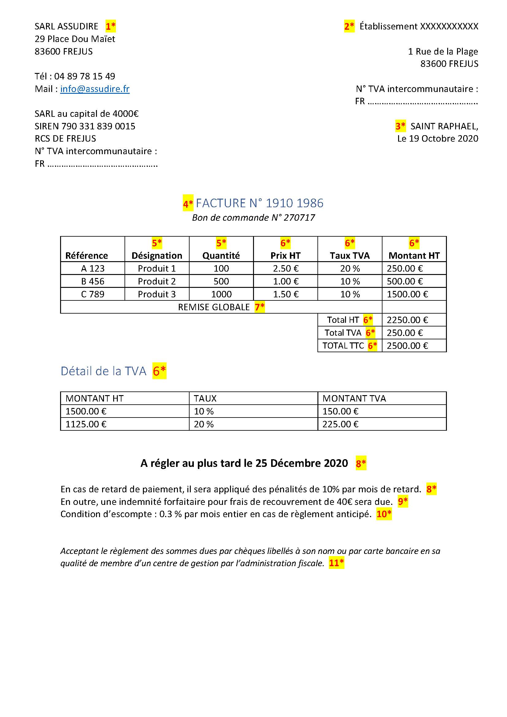 Les mentions à caractère général qui doivent figurer sur les factures sont reproduites sur le modèle ci-joint :